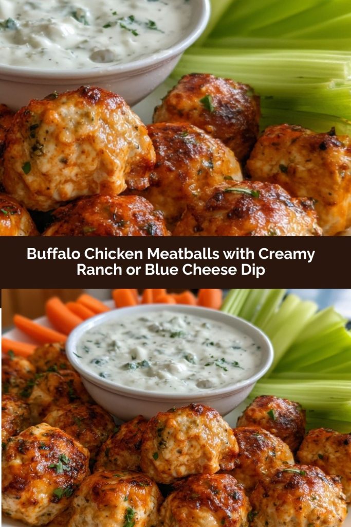 PrintBuffalo Chicken Meatballs with Creamy Ranch or Blue Cheese Dip
