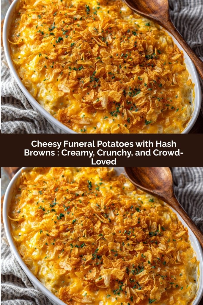 Learn how to make the BEST Cheesy Funeral Potatoes – a creamy, crunchy hash brown casserole that’s always a crowd-pleaser! This easy recipe uses frozen hash browns, sour cream, cheddar cheese, and a buttery cornflake topping. Perfect for potlucks, holidays, Easter, Thanksgiving, Christmas, or family dinners. This comforting side dish is a classic cheesy potato casserole that feeds a crowd. Get step-by-step instructions, make-ahead tips, and delicious recipe variations. #funeralpotatoes #hashbrowncasserole #potatocasserole #comfortfood #potluckrecipes #easysidedish #cheesypotatoes #crowdpleaser #holidayrecipes