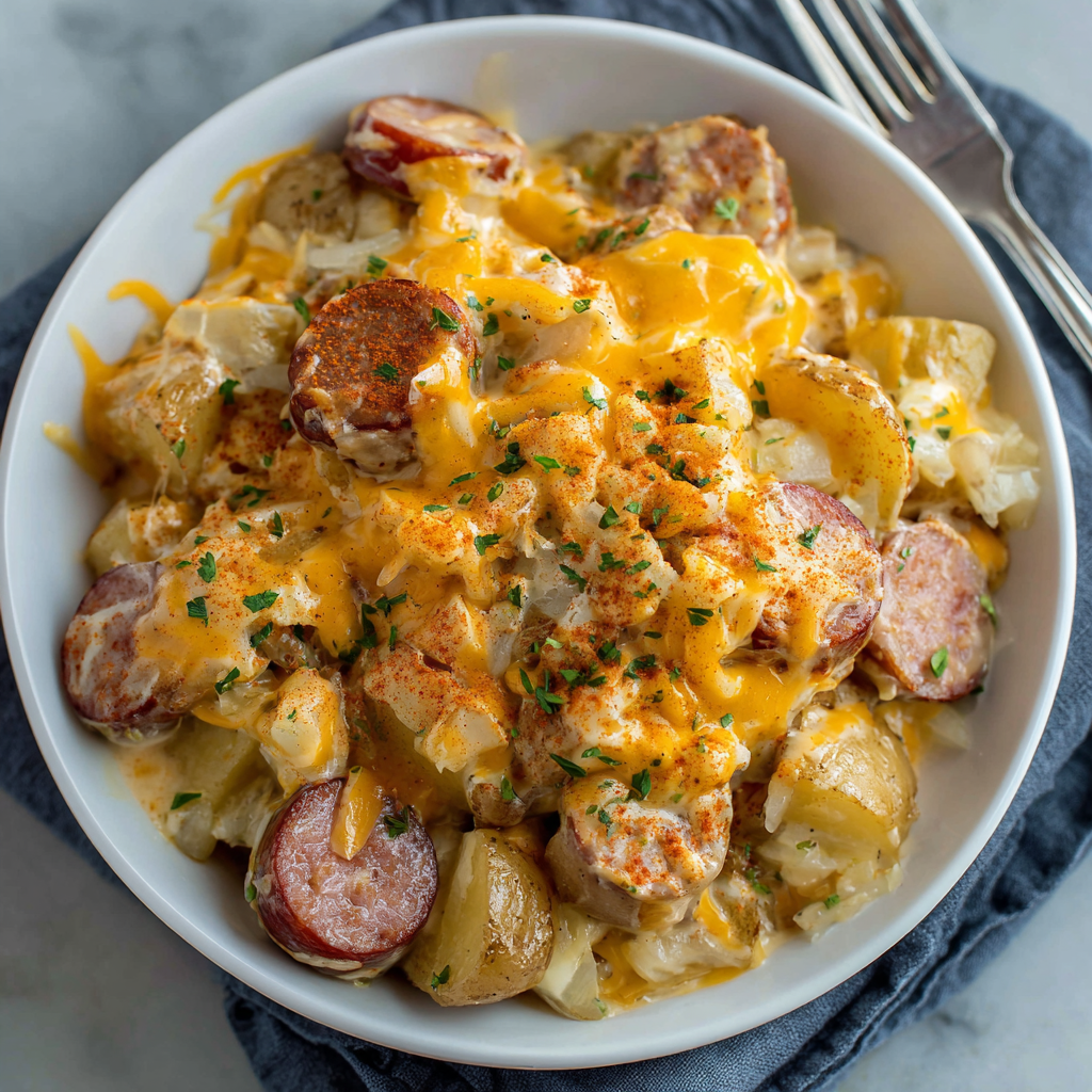 Today, we’re making my legendary Cheesy Sausage & Potato Casserole. This isn’t just a recipe; it’s a hug in a bowl, a guaranteed crowd-pleaser, and your secret weapon for busy days. We’re talking smoky sausage, tender potatoes, and a creamy, dreamy sauce that melds everything into pure comfort gold. The best part? It’s a glorious “dump meal” that requires barely any prep. You’ll have it assembled in about 10 minutes flat, then you’re free to walk away and claim those hours back for yourself.