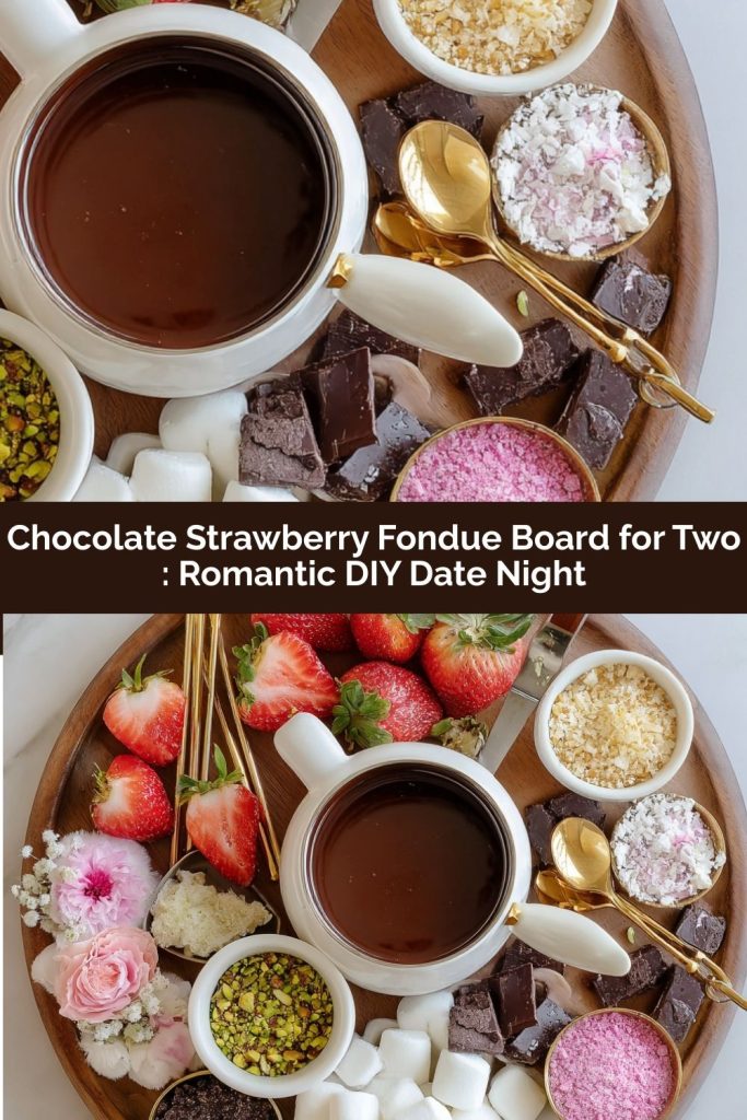 This Chocolate Strawberry Fondue Board for Two is the ultimate at-home date night indulgence. Featuring rich, warm dark chocolate fondue, skewered strawberries, and luxe toppings like pink sea salt, pistachio dust, and crushed meringue, it’s a dreamy setup made for cozy evenings and sweet celebrations. Simple to build, beautiful to serve, and irresistible to dip.