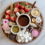 This Chocolate Strawberry Fondue Board for Two is the ultimate at-home date night indulgence. Featuring rich, warm dark chocolate fondue, skewered strawberries, and luxe toppings like pink sea salt, pistachio dust, and crushed meringue, it’s a dreamy setup made for cozy evenings and sweet celebrations. Simple to build, beautiful to serve, and irresistible to dip.