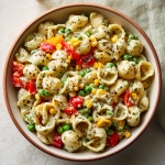This Creamy Pesto Pasta Salad is the ultimate side or light lunch—bold, herby, and satisfyingly creamy. Tossed with sweet corn, peas, and red bell pepper for crunch and color, it’s a feel-good, make-ahead dish that works perfectly for picnics, potlucks, or meal prep. It’s comforting and veggie-loaded, all in one bowl.