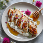 Lavender-Honey Chicken Breasts with Whipped Goat Cheese is a fresh, elegant recipe that blends floral sweetness with creamy tang. Lightly glazed with honey infused with dried lavender, the tender chicken pairs beautifully with a cloud of whipped goat cheese. It’s perfect for spring brunches, garden gatherings, or anytime you want to serve something delicate, aromatic, and visually stunning. Serve with roasted vegetables or a fresh spring salad for a full experience.