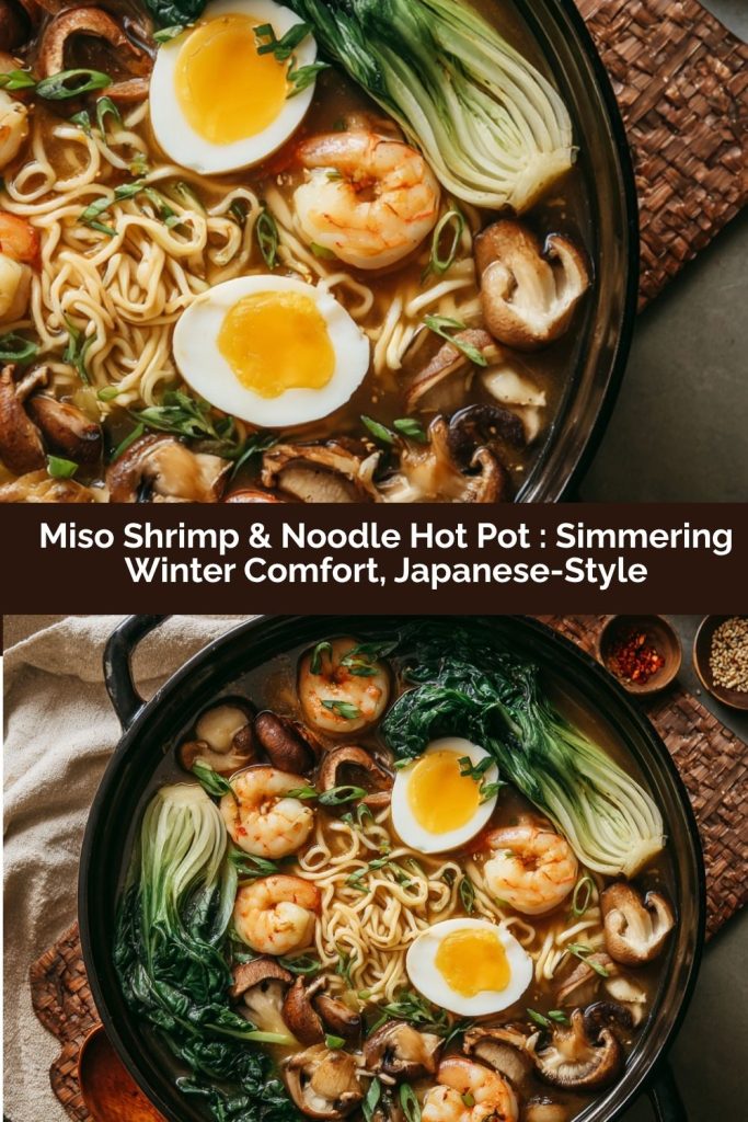 This Miso Shrimp & Noodle Hot Pot is a deeply warming dish built for cozy nights. Inspired by Japanese nabemono, it features a savory miso broth simmering with juicy shrimp, hearty noodles, mushrooms, and winter greens. Easy to customize and perfect for sharing, this one-pot wonder brings the soothing, soul-hugging flavors of Japan to your table—just simmer, serve, and slurp.
