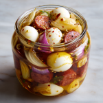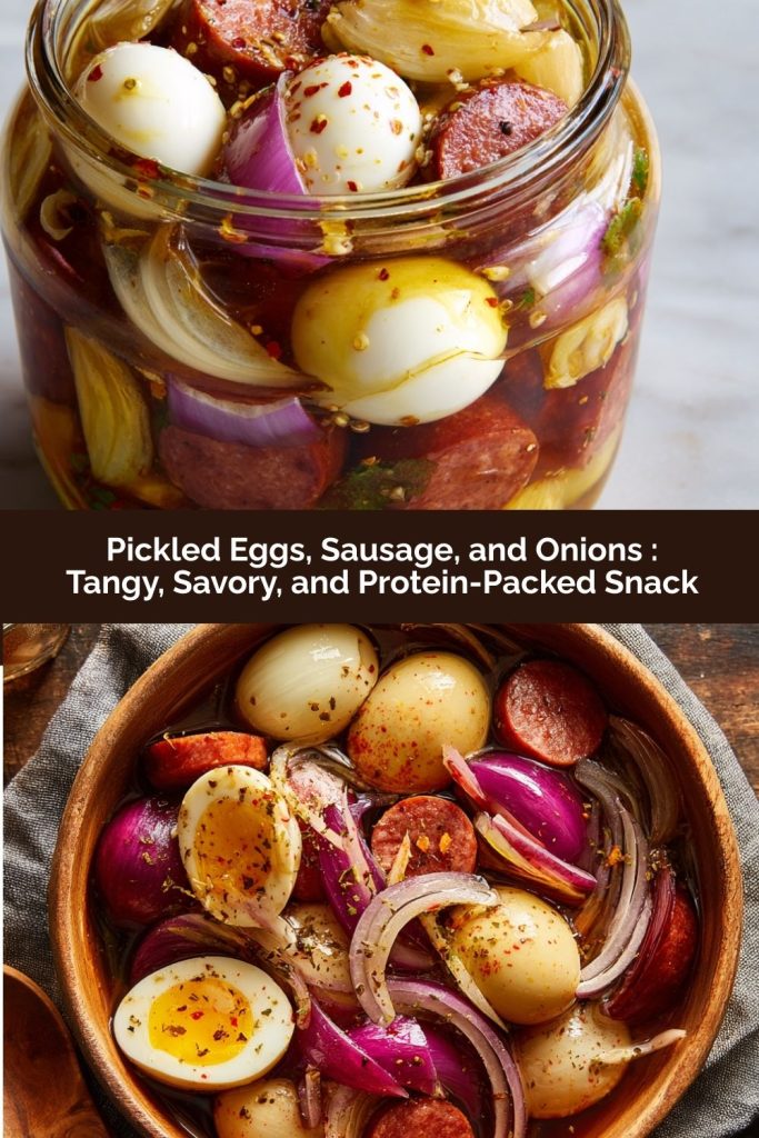 Pickled Eggs, Sausage, and Onions aren’t just a snack—they’re a conversation starter, a fridge showstopper, and a little jar of tangy, savory joy. The magic of this recipe lies in its simplicity and patience: a few humble ingredients, a spiced vinegar brine, and a few days of waiting create layers of flavor that are worth every minute.