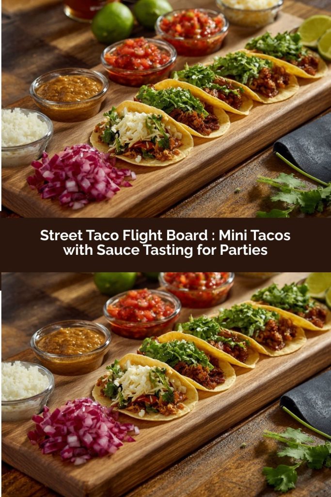 Forget everything you know about stressful party cooking. I’m here to introduce you to the Street Taco Flight Board—where the cozy joy of taco night meets the interactive, shareable charm of a chic charcuterie spread. Imagine: rows of perfectly imperfect mini tacos, each one a two-bite wonder, lined up like a tasting flight at your favorite brewery. Beside them, little bowls of vibrant, bold sauces—a smoky chipotle crema here, a tangy salsa verde there—just waiting to be drizzled, dipped, and debated.