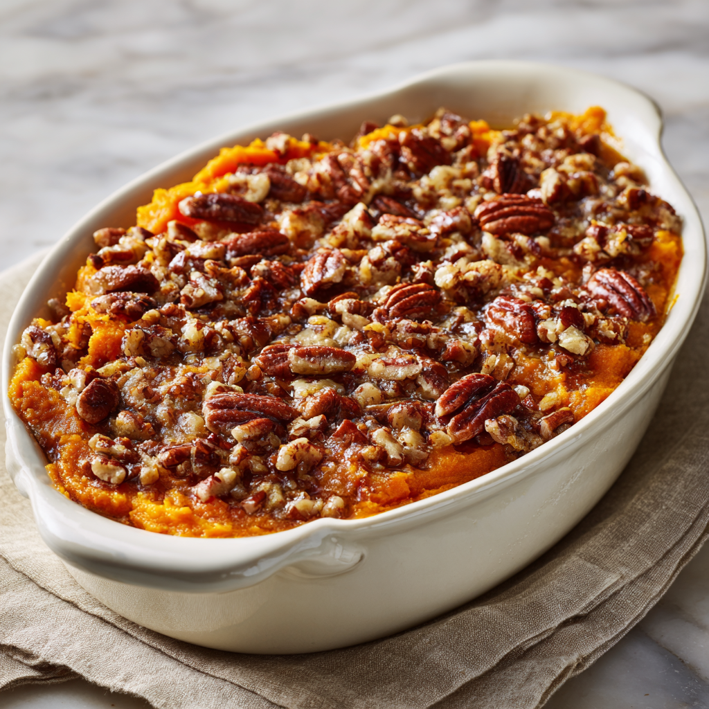 This sweet potato casserole blends creamy, smooth sweet potatoes with a buttery pecan crumble topping. It’s the kind of side dish that feels like dessert—rich, comforting, satisfying—yet still fits on the holiday table. Get ready for golden crunch meeting velvety sweetness.